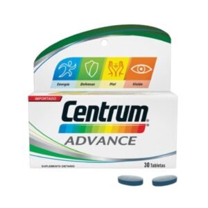 Llena tus días de fuerza y energía con Centrum Advance y su fórmula especializada para hombres y mujeres de 18 a 49 años, te brinda Energía; La vitamina B2 (Riboflavina) es necesaria para la obtención de energía a partir de proteínas, grasas y carbohidratos. Defensas; Una ingesta adecuada de Zinc ayuda a fortalecer las defensas del organismo. Visión; La Vitamina A juega un papel fundamental en la visión, en el mantenimiento y regeneración de los huesos y dientes, en la reproducción y en el sistema inmunológico. Integridad de la piel; La vitamina B2 ayuda para la integridad de la piel. Huesos fuertes; el calcio ayuda en el desarrollo de huesos y dientes fuertes. La Vitamina D ayuda al organismo a utilizar el Calcio y el Fósforo. Centrum Advance Contiene Vitamina B2, Vitamina A ,Vitamina B2, Zinc, Calcio, Hierro, Vitamina C , ESTE PRODUCTO ES UN SUPLEMENTO DIETARIO, NO ES UN MEDICAMENTO Y NO SUPLE UNA ALIMENTACIÓN EQUILIBRADA.