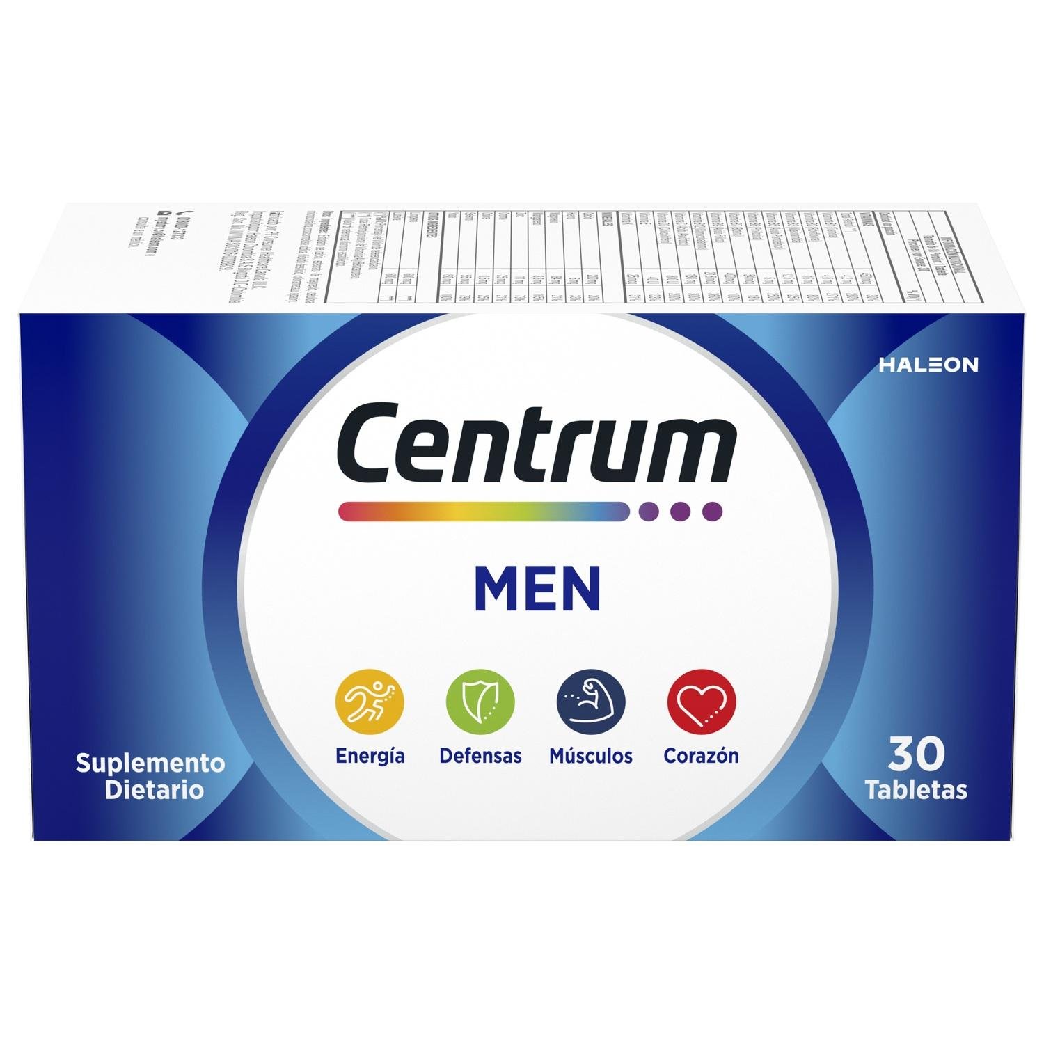 Tu cuerpo sano y fuerte con Centrum Men, el suplemento multivitamínico formulado especialmente para hombres de 18 a 49 an~os. Te brinda Energía; La vitamina B2 (Riboflavina) es necesaria para la obtención de energía a partir de proteínas, grasas y carbohidratos. Defensas; Una ingesta adecuada de Zinc ayuda a fortalecer las defensas del organismo. Funcionamiento muscular normal; La Vitamina D contribuye al normal funcionamiento muscular. Salud del corazón; La Vitamina B1 puede contribuir a la salud del corazón. Huesos fuertes; el calcio ayuda en el desarrollo de huesos y dientes fuertes. La Vitamina D ayuda al organismo a utilizar el Calcio y el Fósforo.? Centrum Men Contiene Vitamina B2, Vitamina D ,Vitamina B1, Zinc, Calcio, Hierro, Vitamina C.?
