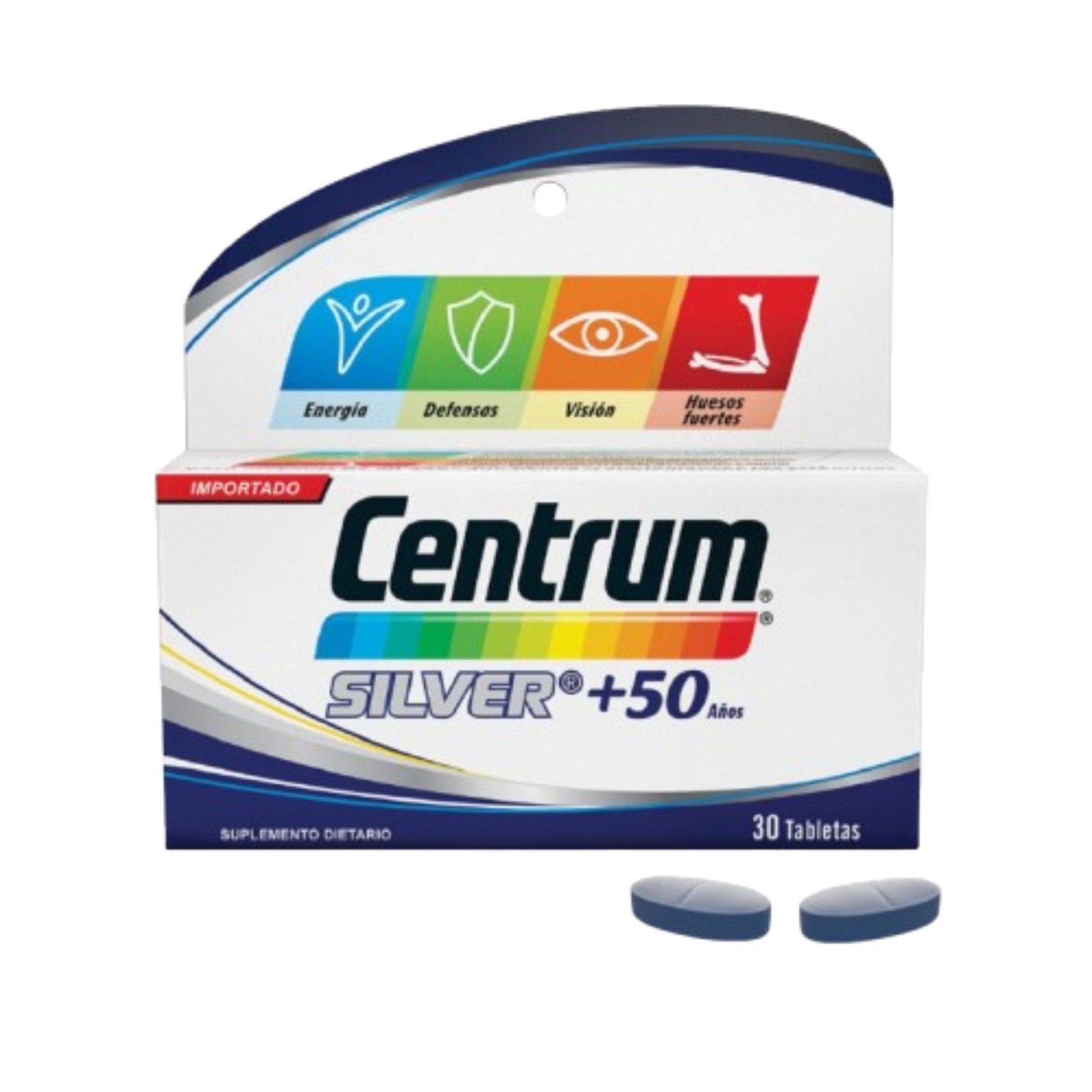 Centrum Silver Contiene Vitamina A, Zinc ,Vitamina D, Vitamina B2, Calcio, Hierro, Vitamina C , ESTE PRODUCTO ES UN SUPLEMENTO DIETARIO, NO ES UN MEDICAMENTO Y NO SUPLE UNA ALIMENTACIÓN EQUILIBRADA.