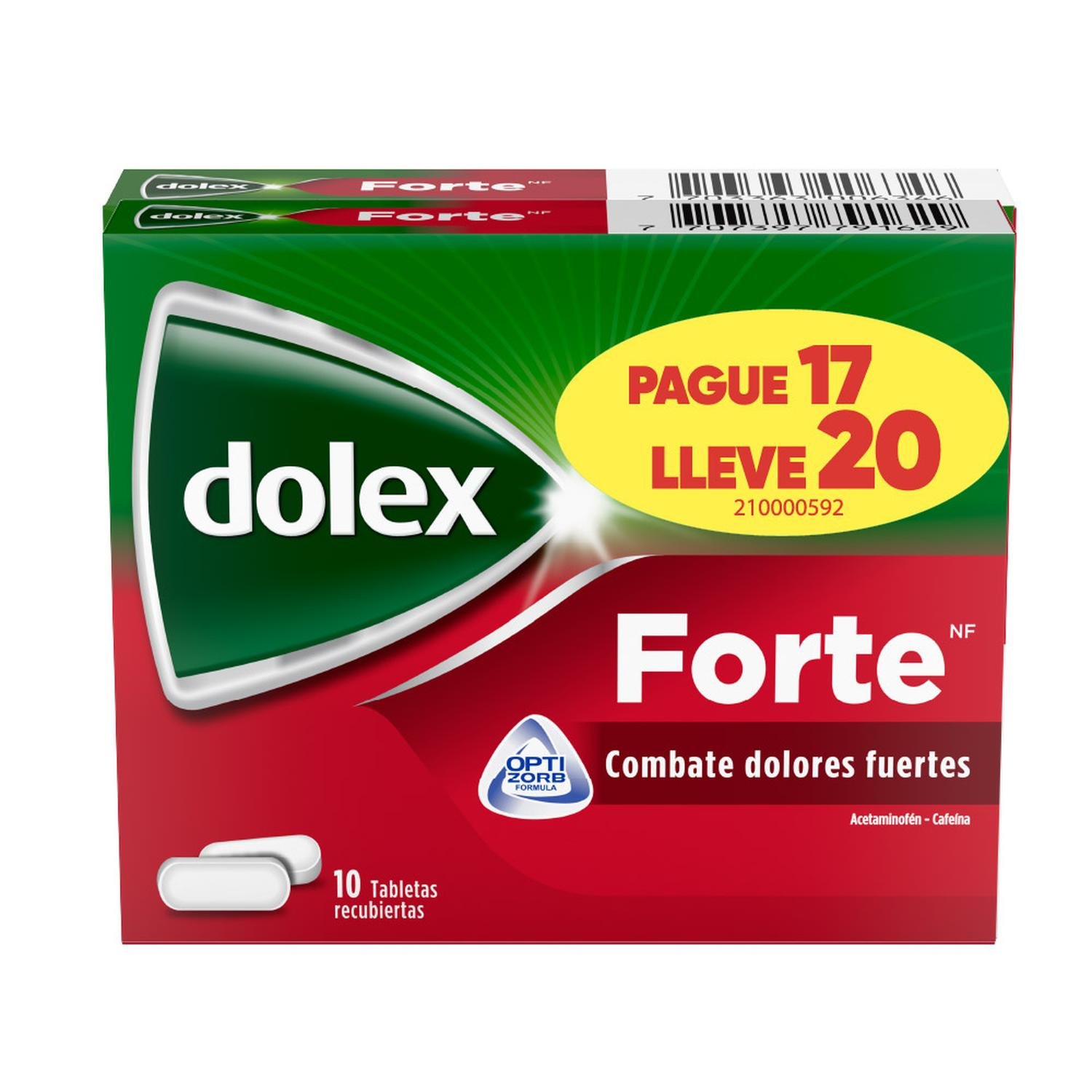 Dolex Forte Alivio del dolor fuerte y rápida absorción, Fórmula mejorada con tecnología OPTIZORB oferta pague 17 lleve 20 Tabs dolex Forte combate* 6 tipos de dolor: · Dolor de cabeza · Dolor muscular · Dolor de espalda · Dolor articular · Dolor dental · Dolor de garganta *El principio activo en Dolex Forte combate 6 tipos de dolor. Asociado a dolor musculoesquelético.