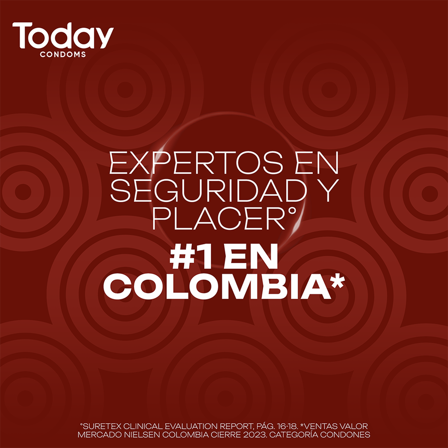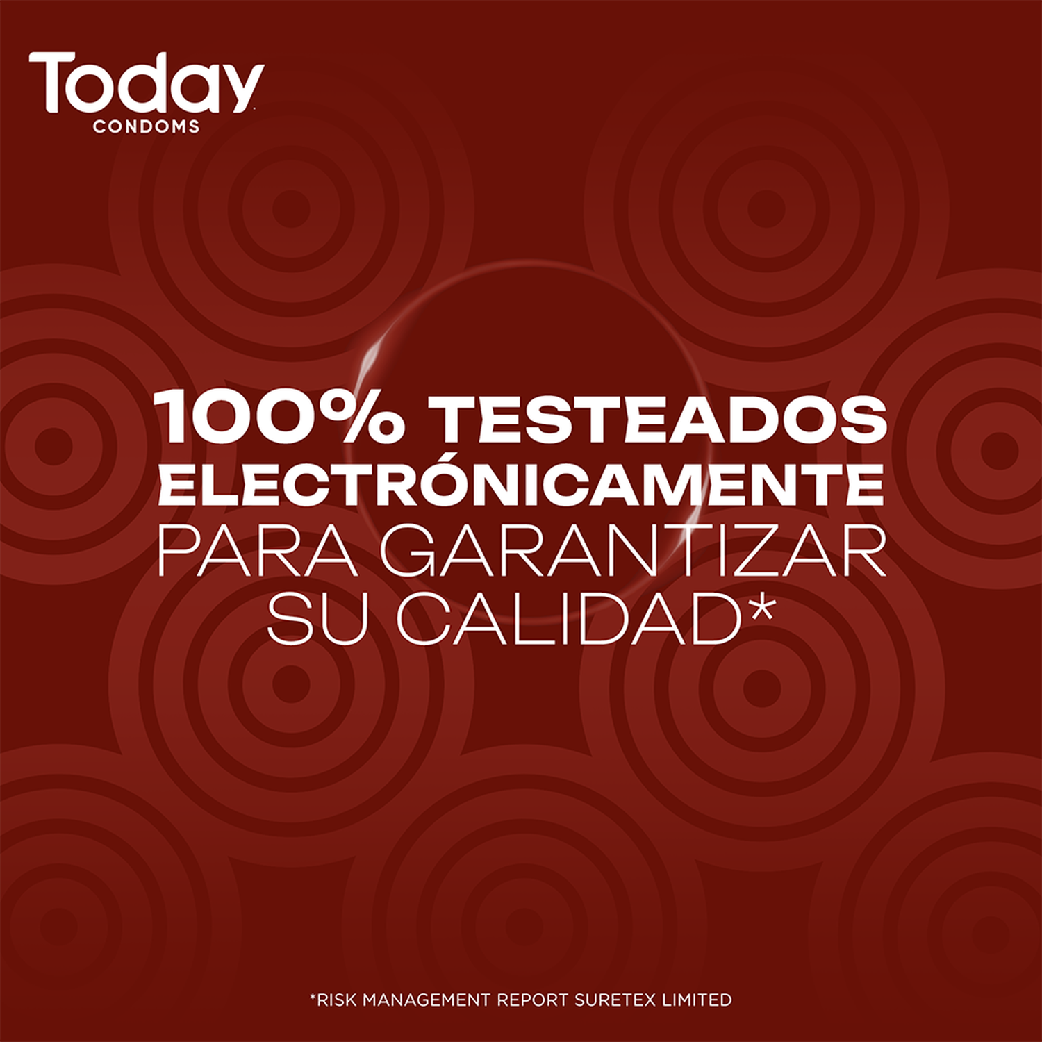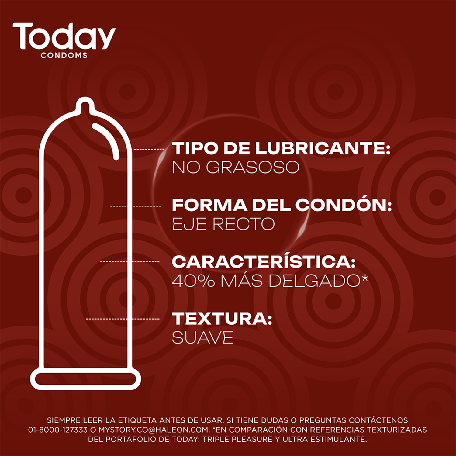 40 % más delgado con extra lubricacióno máxima seguridad y sensibilidad . ?*En comparación con referencias texturizadas del portafolio placer de Today: Triple Pleasure y Ultraestimulante.? En comparación con las referencias con lubricante del portafolio Today.